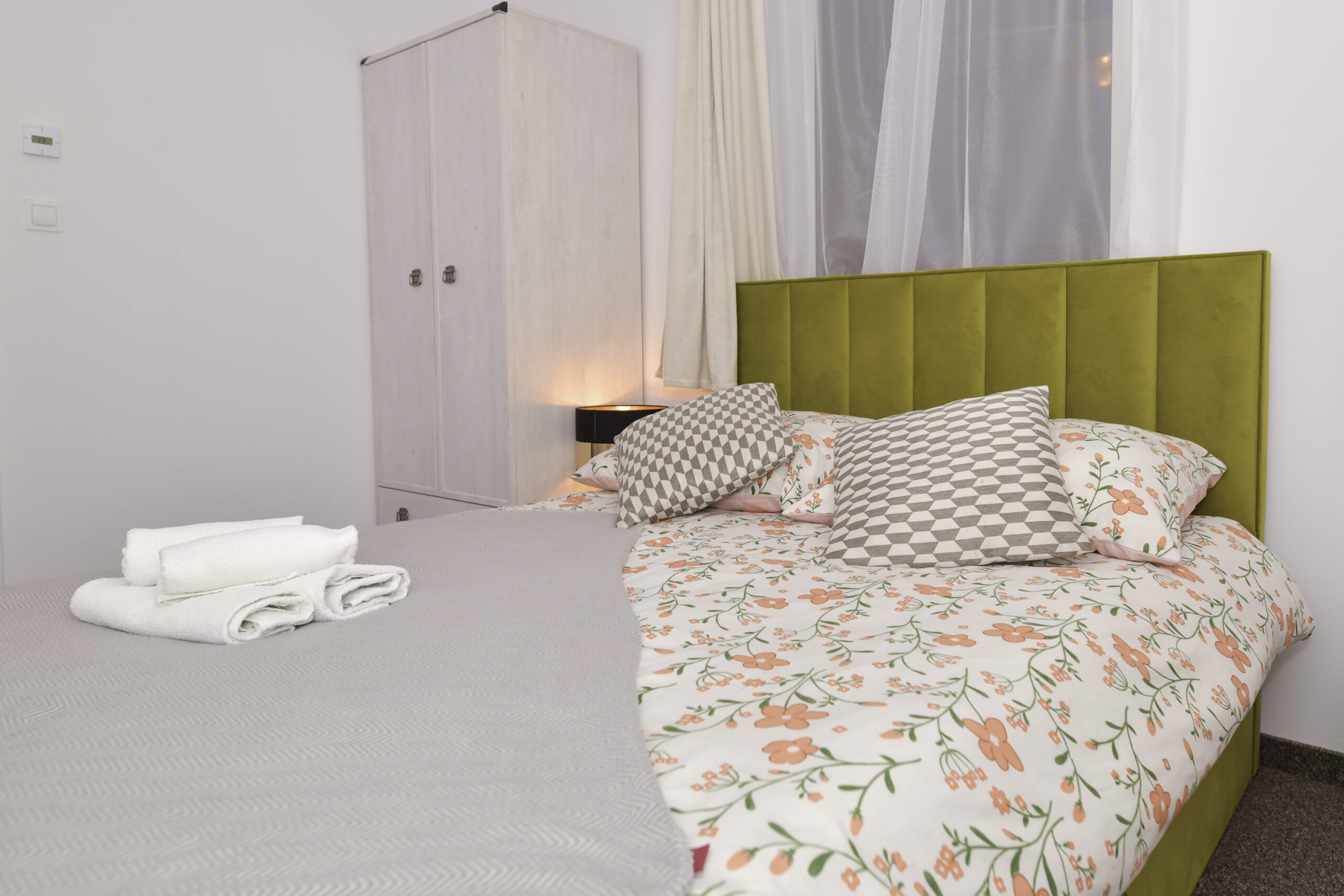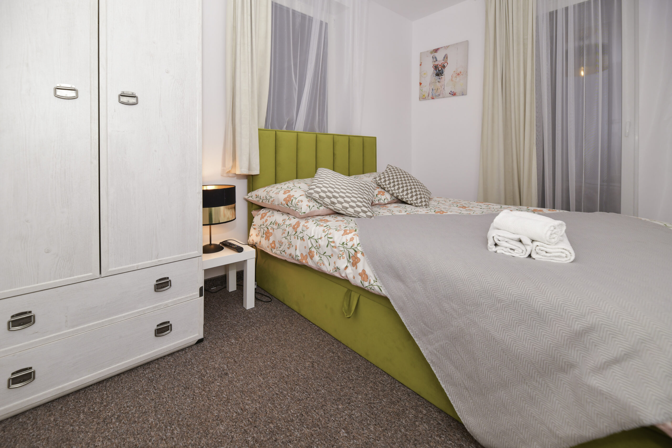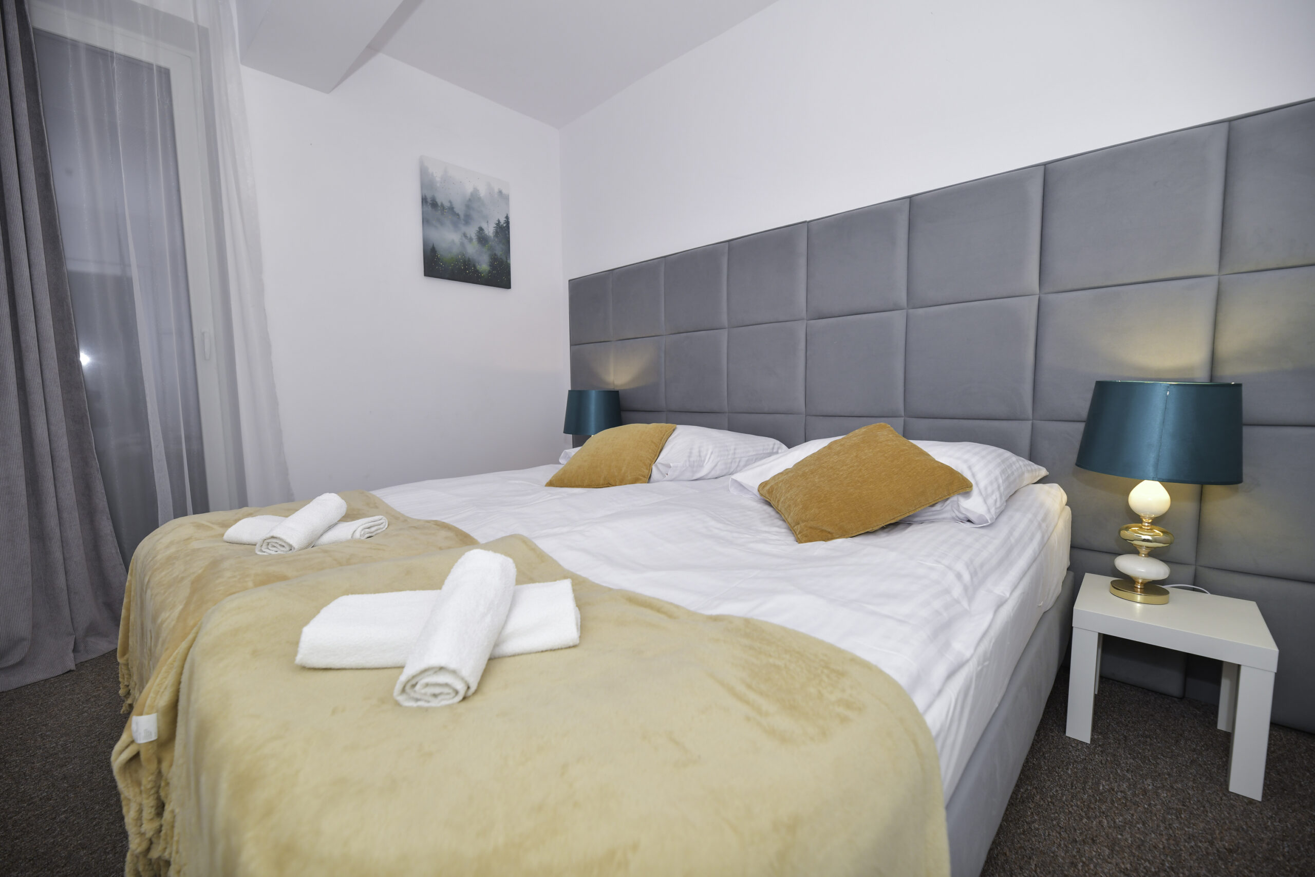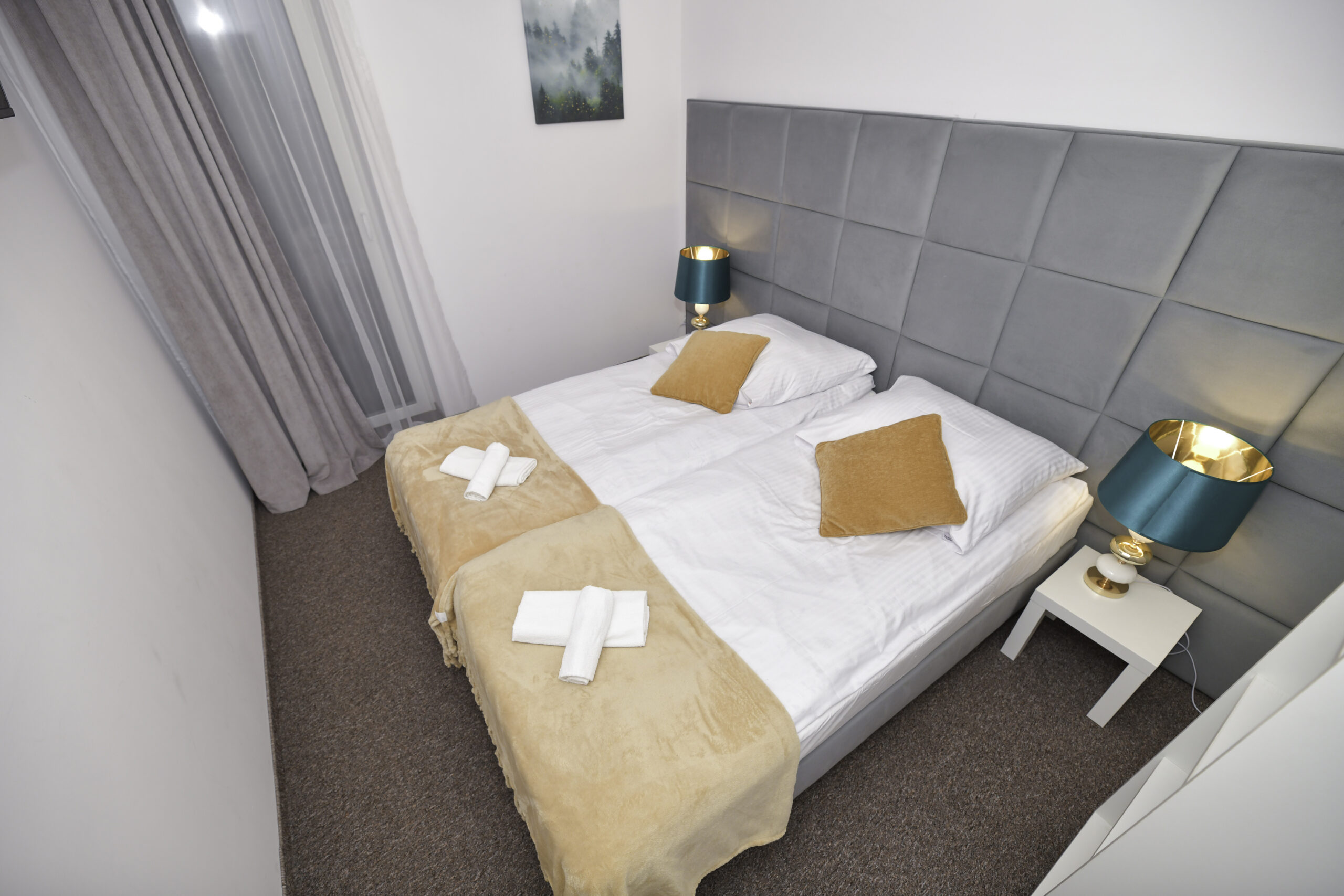 • Łóżka: 1 podwójne + 2 pojedyncze (z możliwością połączenia)